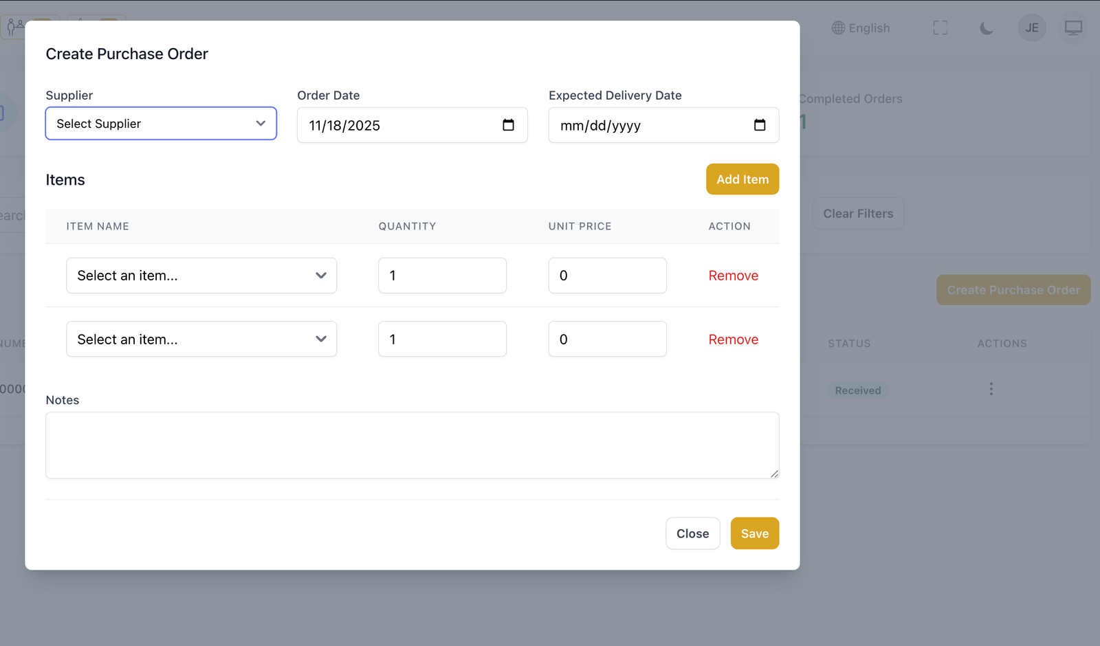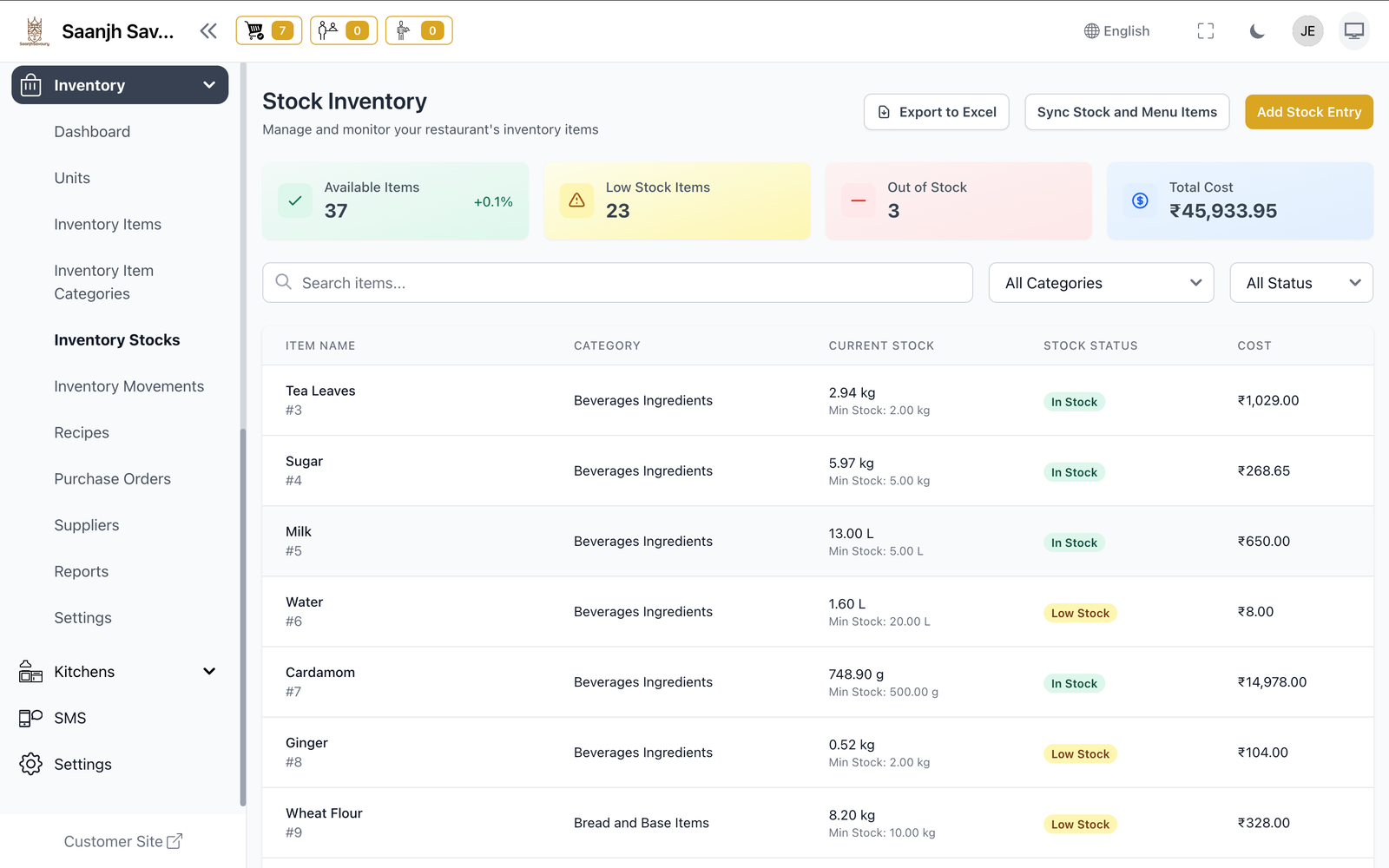 Isko try karoKya khatam ho raha hai — pata chalega. Stock tracking, low alerts, purchase orders, recipe costing — sab automatically.