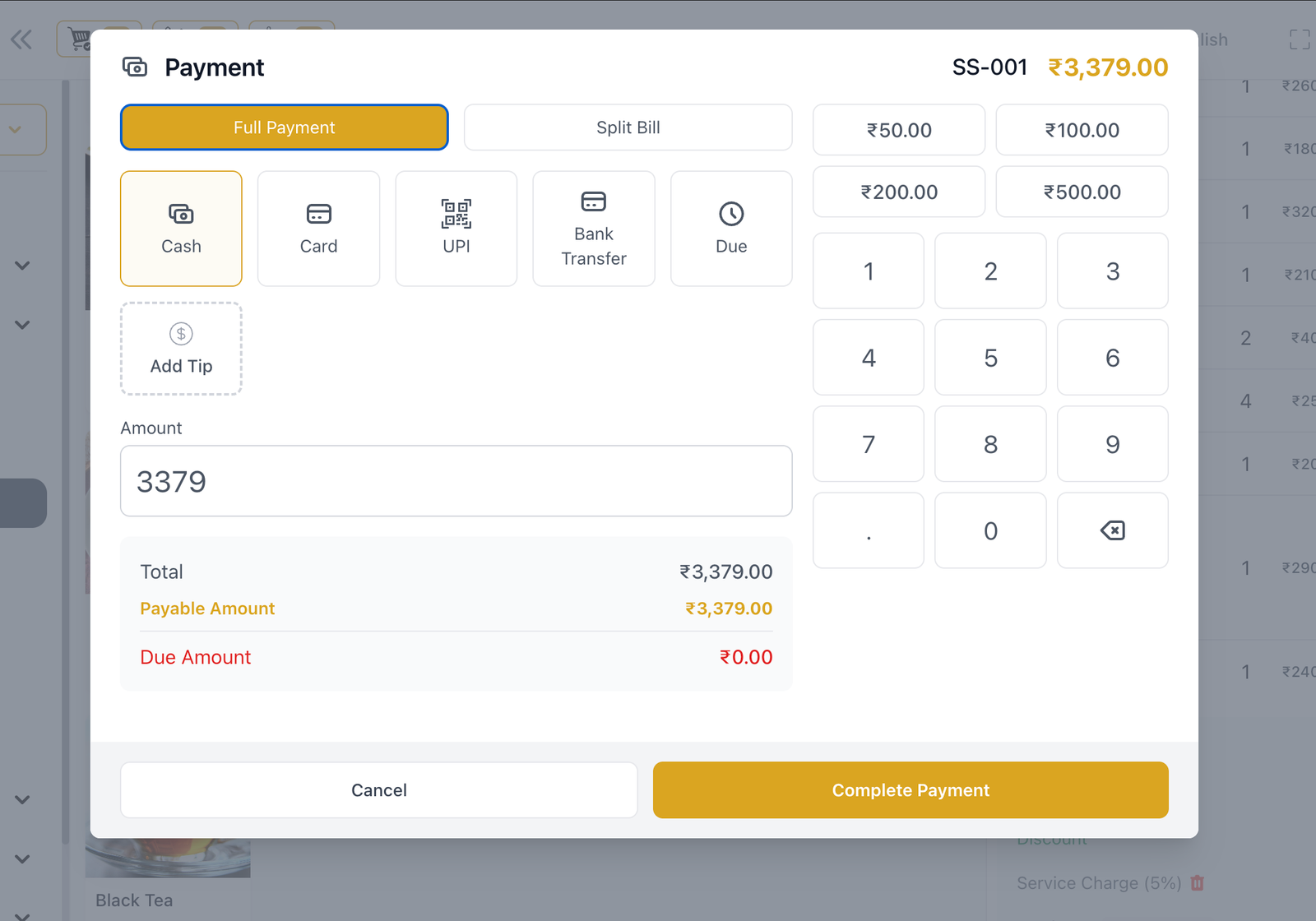 Fast, GST-ready billing — cash, card, UPI sab support karta hai. Split bill, discount, tip — everything ek click me.