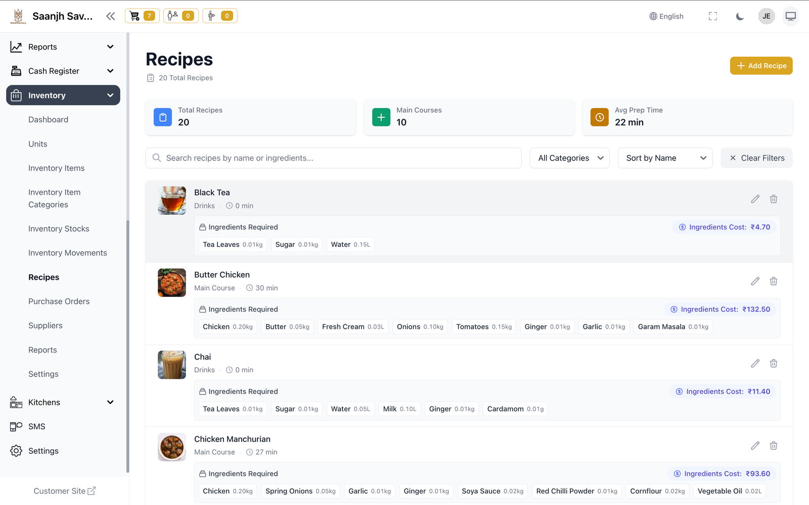 Isko try karoKya khatam ho raha hai — pata chalega. Stock tracking, low alerts, purchase orders, recipe costing — sab automatically.